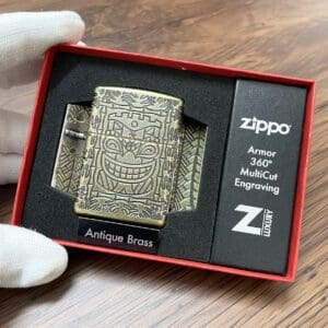 Name: Tiki Design Material: Antique Brass Dimensions: 2 1/4 inches high x 1 1/2 inch wide Condition: New in original box Item number: 46314-000003 This item will be shipped without fluid Orange security label still on the back Zippo Lighters: Iconic Windproof Reliability Welcome to the product details page for Zippo Lighters, the timeless American…