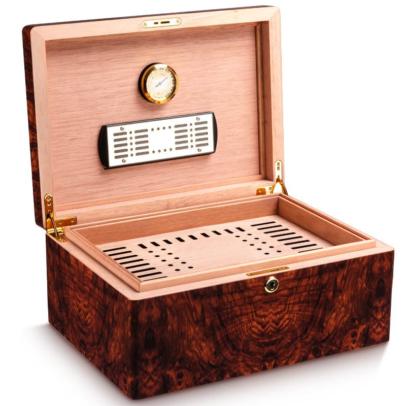 - Desktop / Tabletop Humidors (25–150 cigars) — Classic choice for personal use or small collections. Ideal for home offices, man caves, or as elegant gifts.
