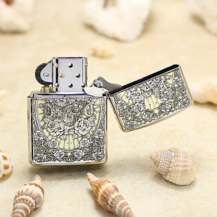Etching Silver Armor Zippo 5-Sides Engraved Beauty and Skull Lighter