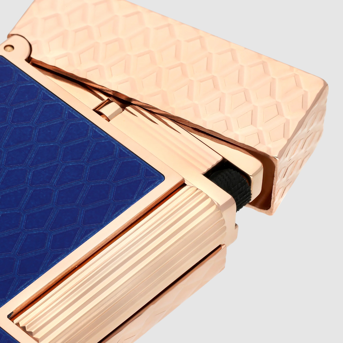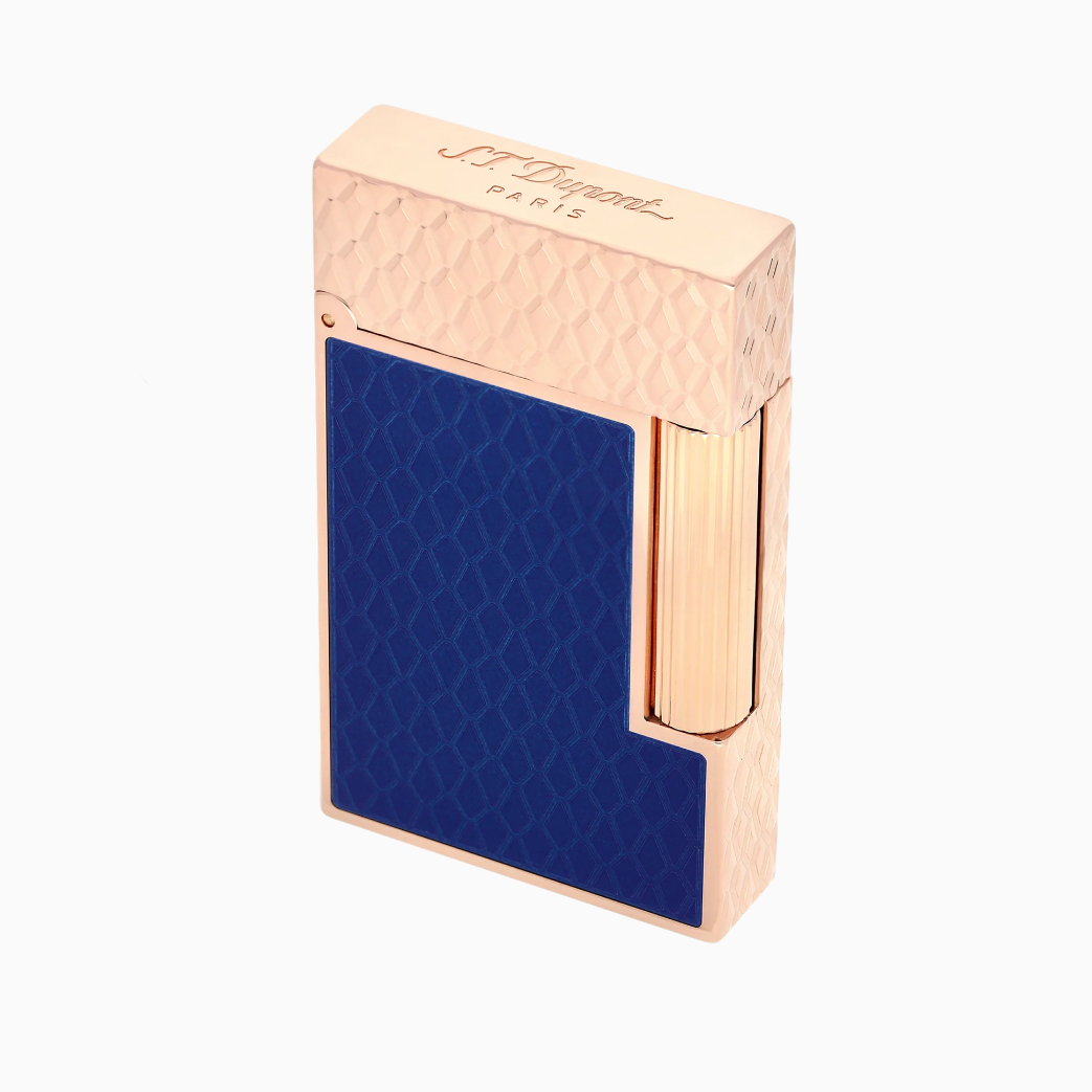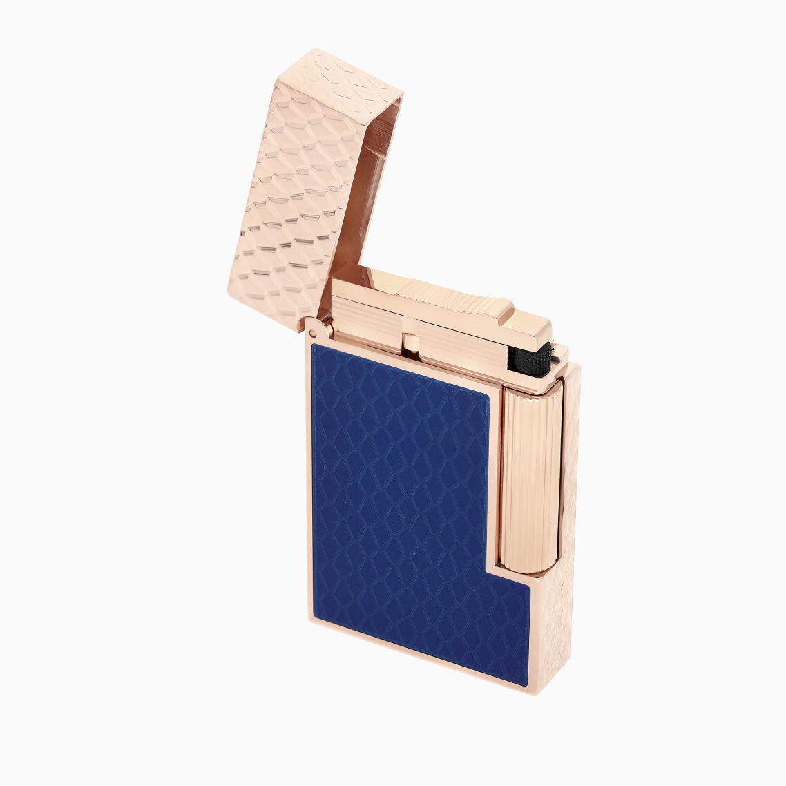 - Ligne 2 with Rose Gold Finish (REF: 016424): Pink-gold lacquer over brass; double yellow flame; guilloché pattern. Ideal for a feminine, elegant touch.