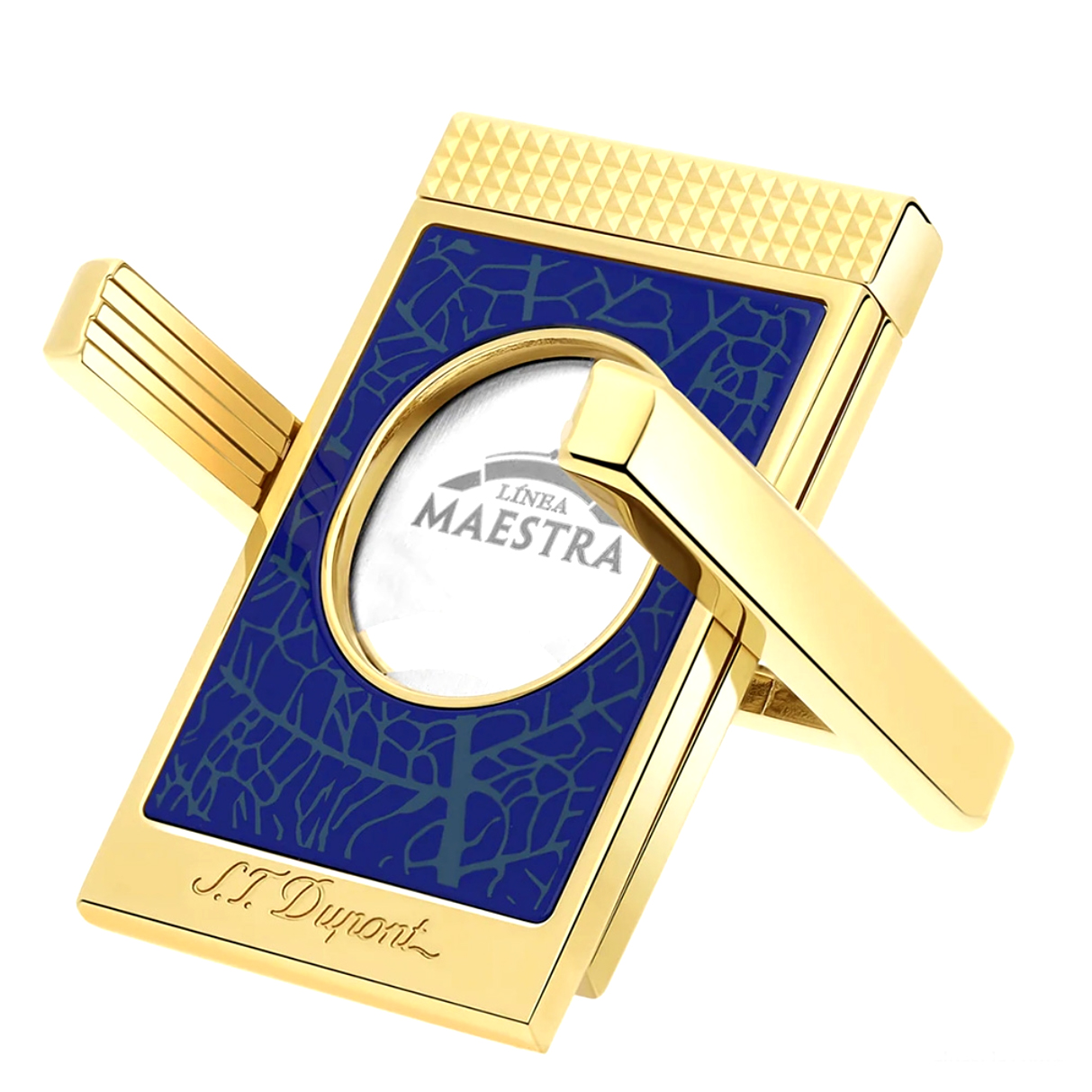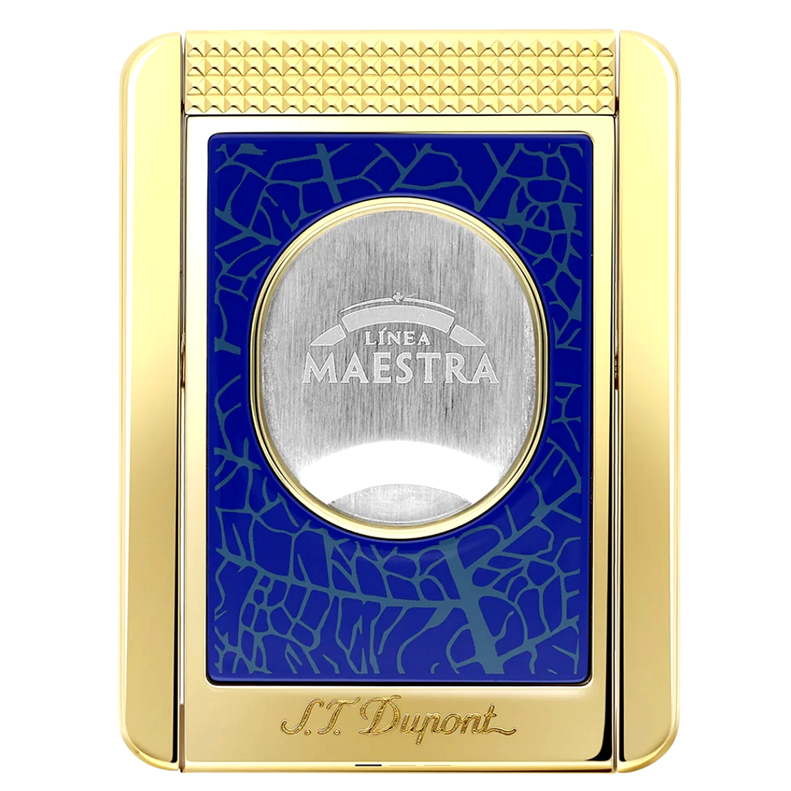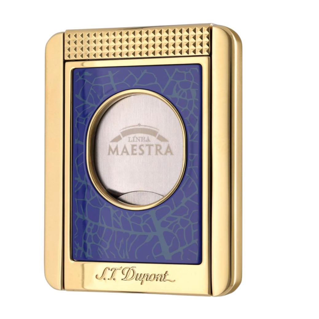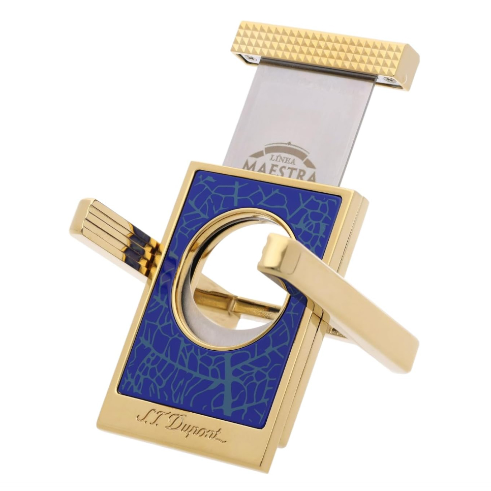 • A Collaboration of Brands: S.T. Dupont and Partagas. One side of Blade Features the Linea Maestra Cigar Logo and the Back Features the Partagas Factory. The Body of the Cutter is in the Iconic Blue of the Linea Maestra Cigar Label and Decorated with a Tobacco Leaf Motif.