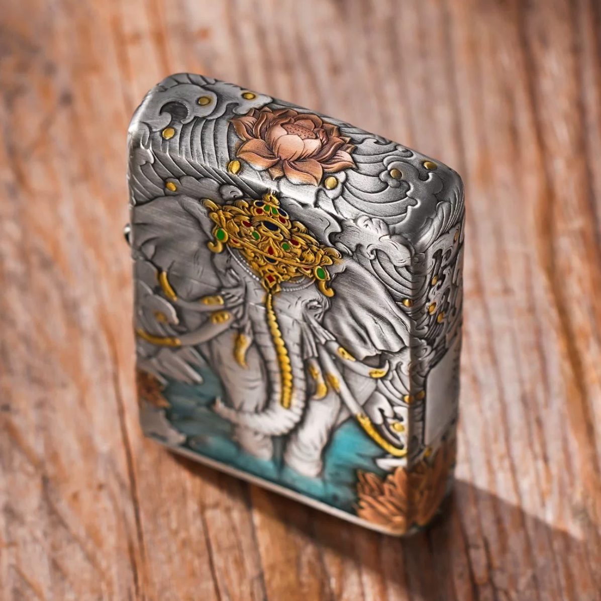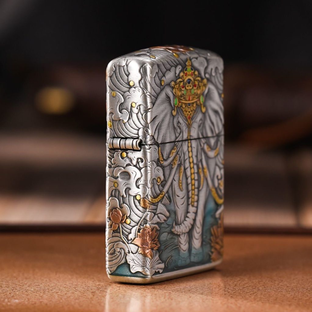 Zippo Armor Etching Silver With Gold Six-tusked White Elephant Lighter